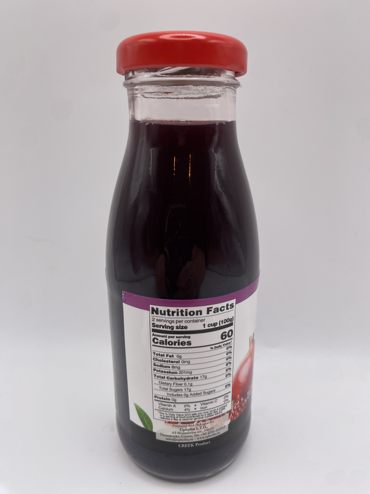 Prémiová čistá šťava z celých granátových jabĺk a arónie. Čistá šťava, ktorá nie je vyrobená z koncentrátu sa vyrába sa priamym lisovaním za studena z najlepších odrôd granátových jabĺk. Šťava je filtrovaná, ale aj napriek tomu obsahuje usadeninu na dne fľaše. Šťava je bez konzervačných látok, cukru a farbív. Obsahuje iba prírodný cukor, ktorý sa prirodzene vyskytuje v granátových jablkách.