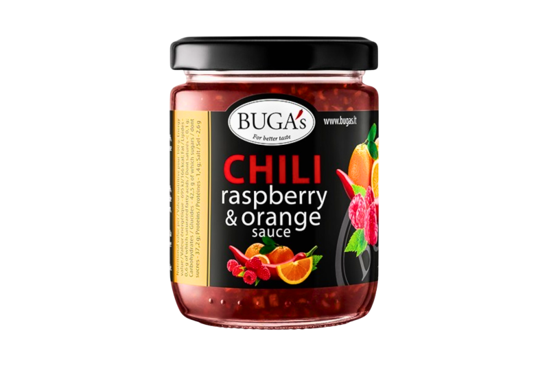 Chilli  pomarančová a malinová omáčka, ochutená malými kúskami z pomarančov, je jedna z najjemnejších produktov BUGA.