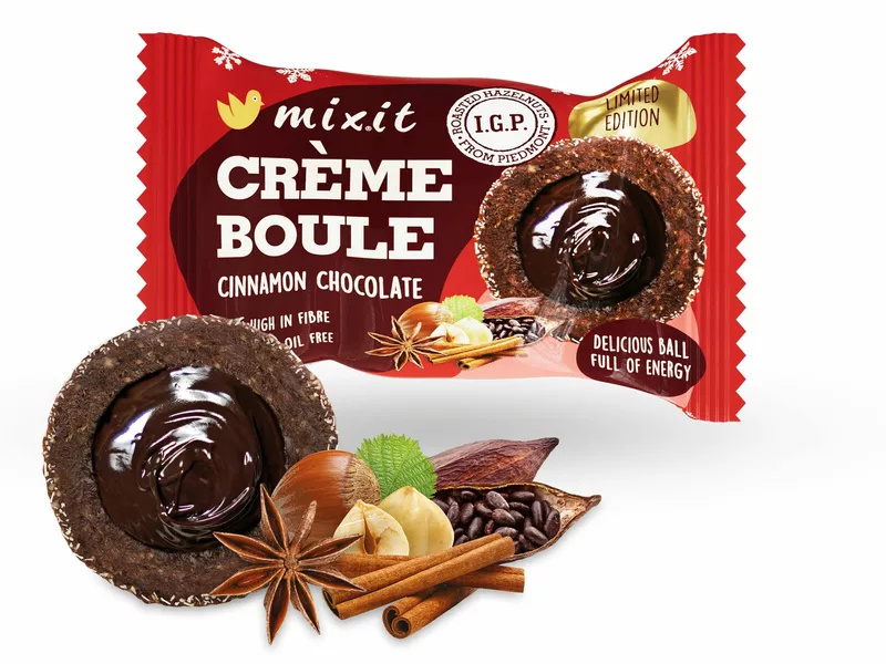 sušené datle 56,1 %, lieskovoorieškový krém 33,3 % (pražené jadrá lieskových orieškov z Piemontu I.G.P. 20 %, hnedý cukor, kakaový prášok so zníženým obsahom tuku, slnečnicový olej, plnotučné sušené mlieko, jedlá soľ, emulgátor: sójový lecitín; prírodný vanilkový extrakt), mleté jadrá kešu orechov 7,9 %, strúhaný kokos 2,1 %, zmes korenia 0,6 % (škorica, klinček, badián)