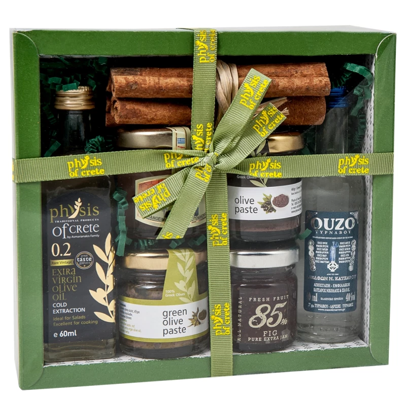 Darčeková krabička so 60ml extra panenského olivového oleja 'Physis of Crete 0,2' dips 4x40g, Ouzo 50ml a 70g škoricových tyčiniek.