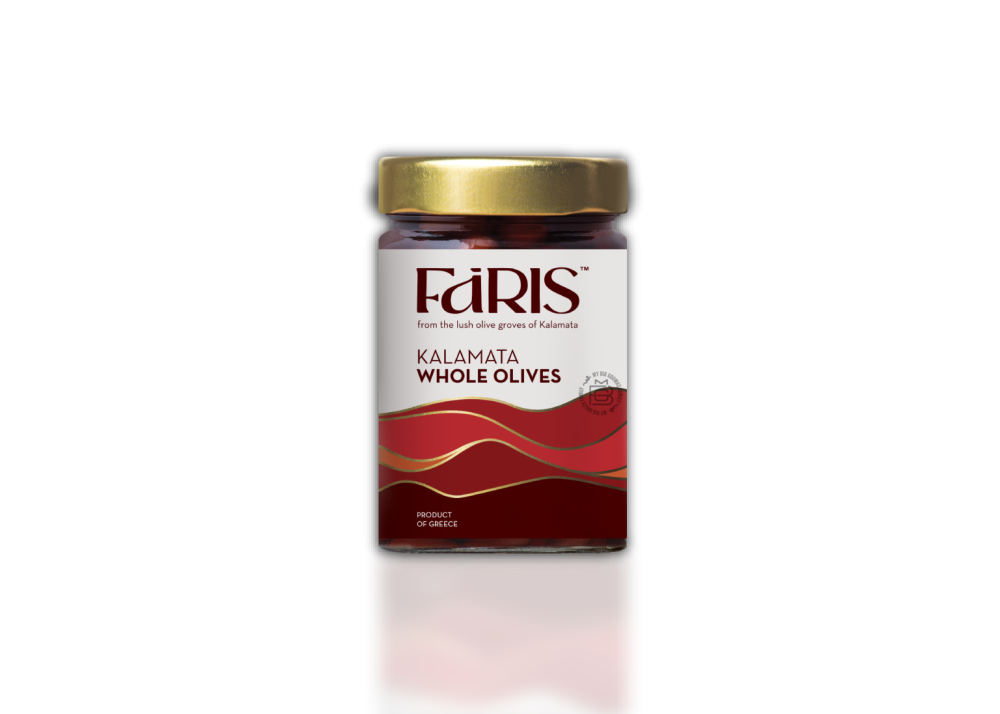 Nakladané olivy FARIS zo 100 % odrody Kalamata olív, ktoré sú ručne zbierané, aby vynikla ich unikátna