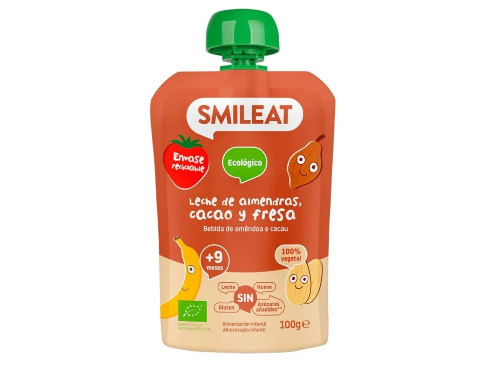 Zloženie: Jablkové pyré* (49,1 %), banánové pyré* (20 %), jahodové pyré* (18 %), mandľové mlieko* (10 %) (voda, mandle*), ryžová múka* (2,25 %), kakaový prášok* (0,65 %), citrónová šťava*. * Z ekologického poľnohospodárstva.
