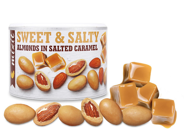 pražené mandle v bielej čokoláde so slaným karamelom (biela čokoláda s karamelom 71 % (cukor, kakaové maslo, sušené mlieko, karamelový prášok s mliečnym tukom (sušené mlieko, sušená srvátka, cukor, mliečny tuk, prírodná vanilková aróma), karamelizovaný cukor 1.5 %, kakaová hmota, emulgátor: lecitíny a sójový lecitín; soľ), jadrá mandlí pražené 27 %, leštiaca látka: arabská guma; cukor, med, jedlá soľ 0,3 %).