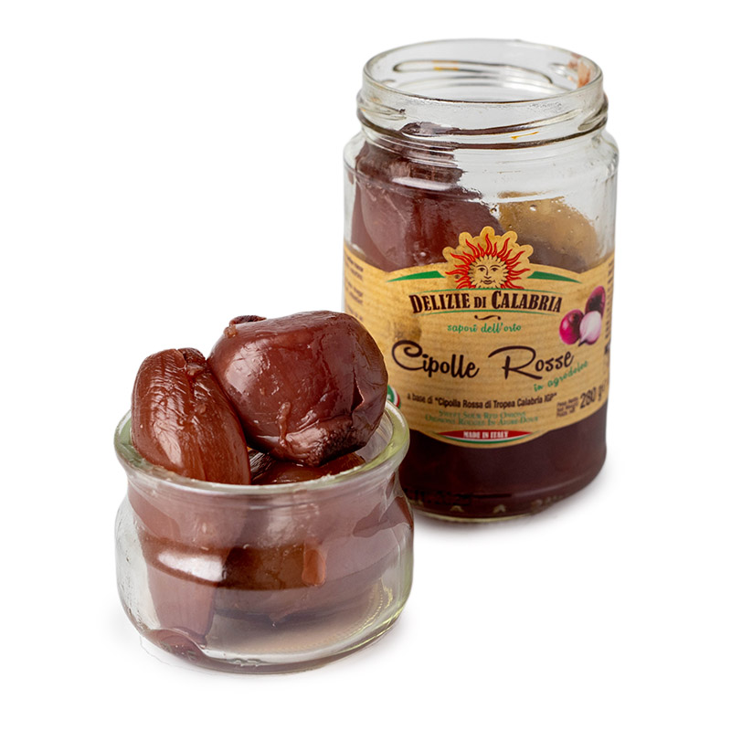Nakladaná červená cibuľa z Kalábrie sa vyznačuje mierne chrumkavou textúrou a spolu so sladkokyslou chuťou zaručuje, že každé sústo bude skutočným potešením. Vďaka nálevu z vínneho octu, soli a cukru cibuľa zmäkne a zkrehne, čím sa utlmí jej štipľavosť ale na druhej strane sa zvýrazní jej chuť a žiarivá farba. Tieto nakladané kalabríjske cibule sú nielen výnimočné svojou plnou chuťou ale aj všestrannosťou. Výborne ladia k mäsovým jedlám, grilovaným špecialitám alebo i do domácky pripravených domácich burgrov či pizze.