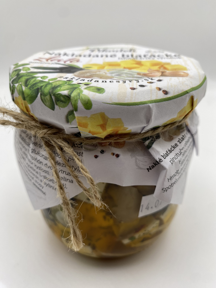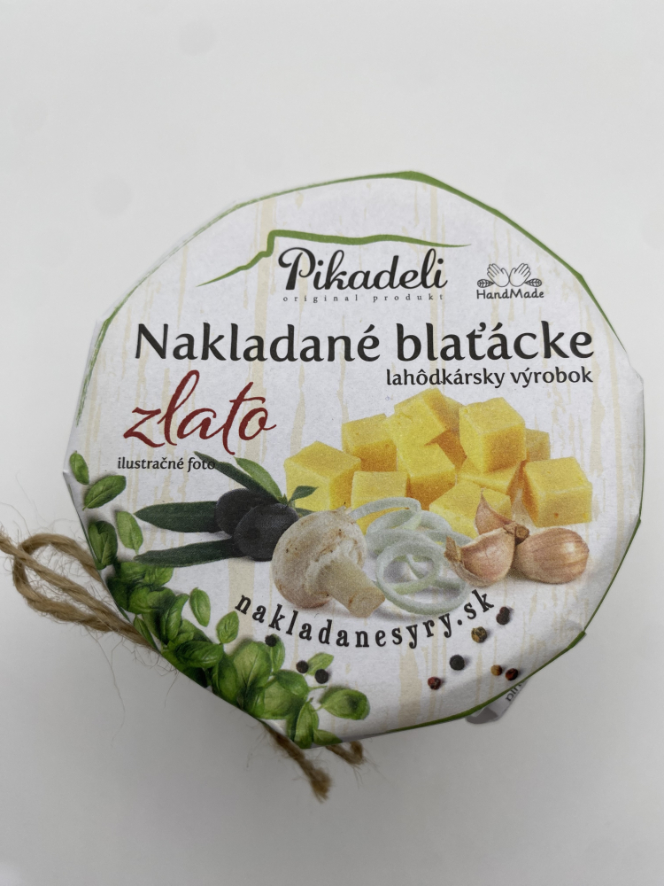 syr blaťácke zlato 68% pp (mlieko, jedlá soľ, mliekarenské kultúry, farbivo annatto norbixin), repkový olej, čierne olivy, cibuľa, šampiňóny, červená paprika, baraní roh, cesnak, zmes korenín a byliniek (môže obsahovať stopy zeleru, horčice, sezamu). Hmotnosť obsahu: 340 g Hmotnosť pevného podielu (pp): 220g