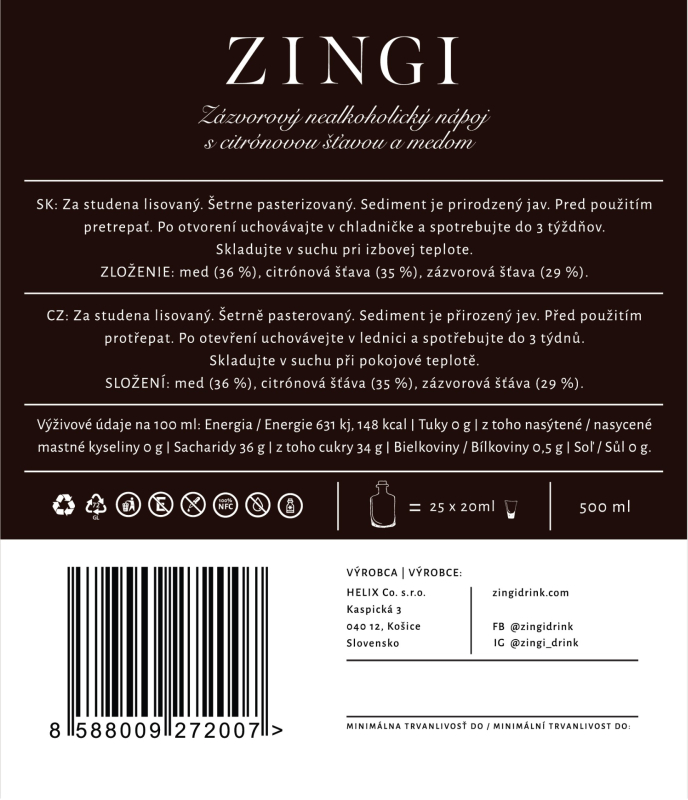Pasterizovaný nápoj ZINGI je 100% prírodný produkt vyrobený na Slovensku z tých najkvalitnejších surovín. Rokmi vyladená receptúra a správny pomer troch základných ingrediencií sa spája v jedinečnej chuti, ktorá v sebe kombinuje ostrosť zázvoru, jemnosť medu a šťavnaté tóny citróna.