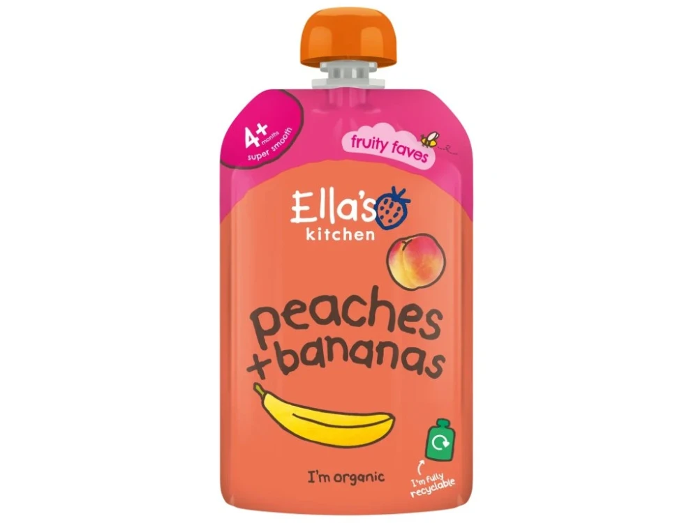 Dobrý deň! Som 100% prírodné ovocné pyré z Ella's Kitchen plné chutného 100% bio pyré z broskýň + banánov s trochou citrónovej šťavy. Nič iné sa nepridáva, dokonca ani voda.
