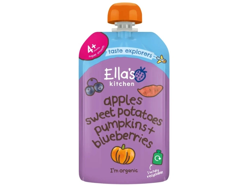 - Ovocná kapsička Ella's Kitchen Sladké zemiaky, tekvica, jablká a čučoriedky, BIO 120g