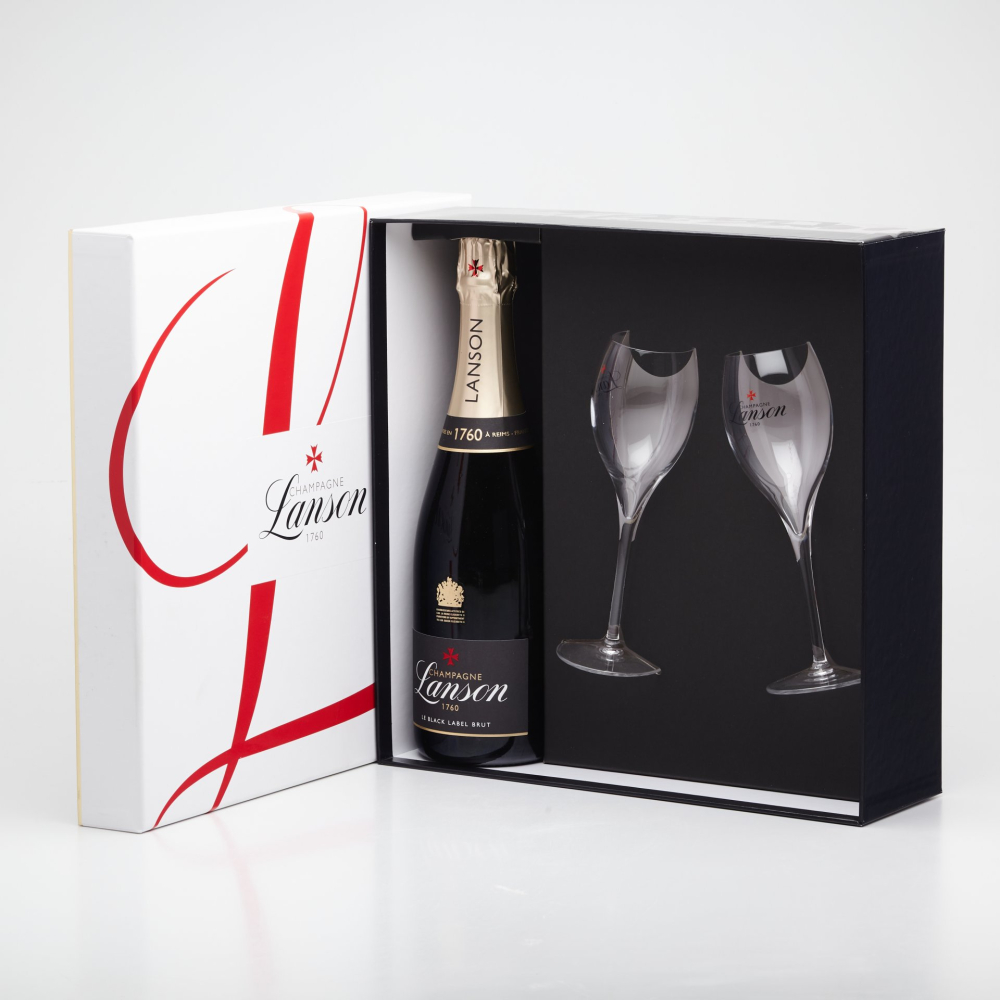 Balenie obsahuje: CHAMPAGNE Lanson 0,75l a 2 ks sklenených pohárov na šampanské s označením v darčekovej krabici.