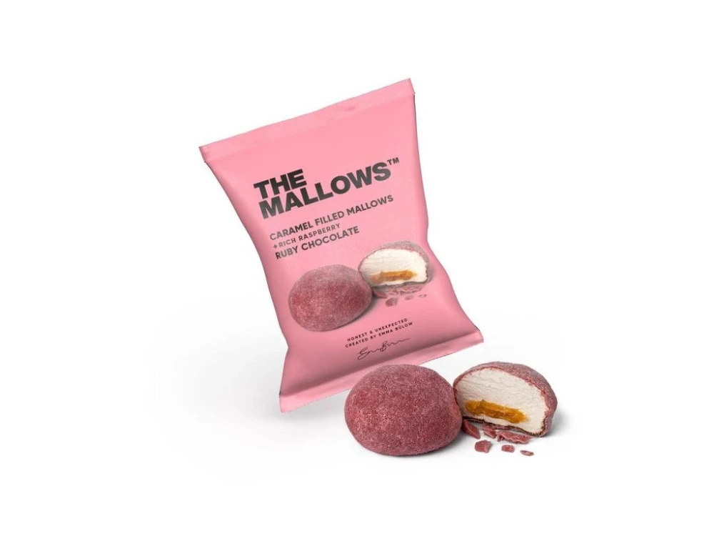 The Mallows – ruby čokoláda a malina sú marshmallows s karamelovou náplňou obalené v ovocnej ruby čokoláde. Sladké karamelové jadro sa pri prvom zahryznutí spojí s vanilkovým marshmallow a vytvára dokonalý kontrast k sviežim malinám a ruby čokoláde na povrchu.