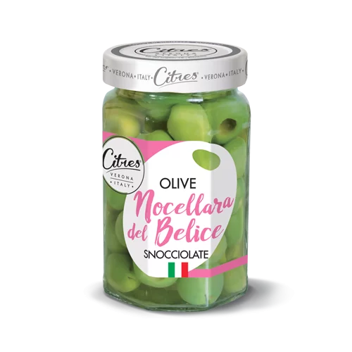 Sicílske zelené olivy Nocellara bez kôstky z údolia Belice. Chrumkavé, zo silnou, mierne sladkou chuťou.